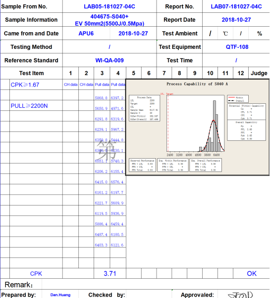 其次,評判超聲波產(chǎn)品的穩(wěn)定性。這個可以要求超聲波企業(yè)提供已有案例的穩(wěn)定性文件,例如cmk﹑cpk﹑ppk文件。下圖是我司客戶50平方銅線+端子的文件: